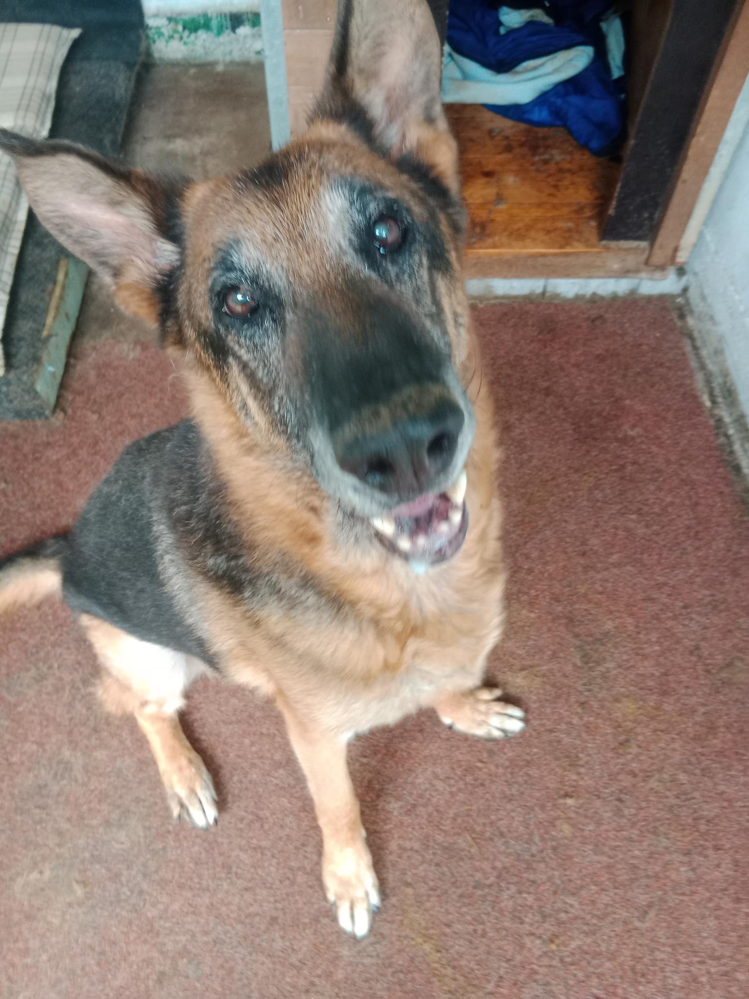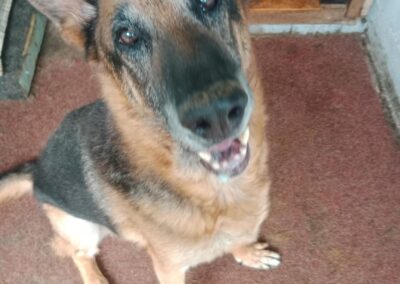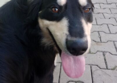 Kříženec, věk 10 let, pes, původní čip nezjištěn, místo nálezu Měčín, datum přijetí: 3.6.2019. Starší kříženec pasteveckého typu. Silný, samostatný pes, který v sobě pastevce nezapře. K lidem si buduje důvěru velmi pomalu, jedná po svém, má svou hlavu a jasné názory. Když si zvykne, umí být milý a kontaktní. Není to pes „na povel“, hledá spíše parťáka než pána.